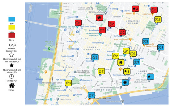 Spatial Visualization of POI recommendation.Figure 7 demonstrates the visited, recommended and visited, and recommended but not visited POIs for Bob, Mary, and Skye, as an example. It could be obviously found that the recommended POIs are reasonable if considering their homes and contexts.