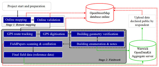 Figure 1 depicts graphically the activities that were part of the different mapping stages of our OSM-based participatory mapping process. Stage 0 consisted of preparatory activities and was useful for setting the agenda prior to the start of the online mapping. The preparation period mainly covered creating training materials, defining responsibilities with local core teams in each partner country, training local teams, procuring high-resolution satellite imagery, identifying neighborhood boundaries with local core teams at partner institutions, and setting up of the online mapping platforms. Securing access to the slum sites was also negotiated during this period. All data collectors who took part in the mapping process but were not familiar with the tools were trained. Stage 1 was for online mapping. We used the Humanitarian OSM Team (HOT) Tasking manager (TM) and this served as an interface for coordination of mapping tasks [36]. The TM provided links to OSM editors (e.g., iD Editor/JOSM), which in turn directed all edits by mappers to be recorded in the OSM database [37]. The online mapping and validation activities ensured the capture of geometrically valid vector data from optical satellite imagery for fieldwork in Stage 2. Beyond online mapping and validation, field-mapping was undertaken to verify the digitized features. Stage 2 period was for fieldwork until the time by which the OSM data was extracted and prepared as a sampling frame. The sampling frame was made up of building structure geometry and names of household heads or representatives. Stage 2 involved using portable global positioning system (GPS) devices to track routes (roads and footpaths); uploading the data onto the OSM database; generating quick reference (QR) coded field paper maps based on Fieldpapers.org technology; annotating the paper maps (Fieldpapers) in the field after checking building structure geometry along with a tablet-based structured questionnaire for building geometry verification and enumeration; scanning the annotated paper maps; and, conflating scanned annotated maps into the OSM database to obtain final field data (reference data). Two key open-source technologies were integrated into the questionnaire template development using OpenDataKit (ODK) and OpenMapKit (OMK) technologies for the household-heads listing survey to inform sampling frame generation [38,39]. ODK server and client tools provided means for mobile a-spatial data collection and management while OMK tools allowed the collection of, and linking to, spatial data as part of the questionnaire administration.
