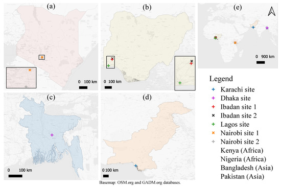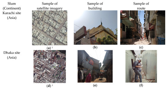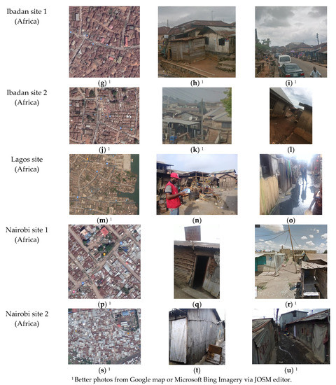 The seven study sites were as follows (see Figure 3 and Figure 4): a slum in Pakistan, city of Karachi anonymized as Karachi site; a slum in Bangladesh, city of Dhaka anonymized as Dhaka site; three slums in Nigeria, cities of Lagos and Ibadan anonymized as Lagos site, Ibadan site 1 and 2; and, two slums in Kenya, city of Nairobi anonymized as Nairobi site 1 and 2 [33,40]. Karachi site is centrally located in a well-established area with permanent and multi-story buildings undergoing vertical levels of new construction. Dhaka site is centrally located in a well-established area with semi-permanent structures, undergoing regular demolitions and reconstructions. Ibadan site 1 is centrally located within a historical area, which is along an old, tarred road with permanent structures in poor condition. Ibadan site 2 is a resettled community at the edge of the city with a well-spaced clear layout and mostly permanent structures. Nairobi site 1 has a settled community and is located about 12 km from the Central Business District (CBD) of the city; the slum structures are made up of mud, timber or tin-roof materials and are mostly in rows. Nairobi site 2 is located about 7 km from the CBD; the slum structures are made up of either iron sheet or tin walls with iron sheet roofs. Figure 4 shows the qualitative sample characteristics of the seven slums in terms of geographical location, satellite imagery, buildings, and routes. The satellite imagery and the photographs also show sample characteristics of the layout of structures as well as rooftop architecture and height qualitatively.