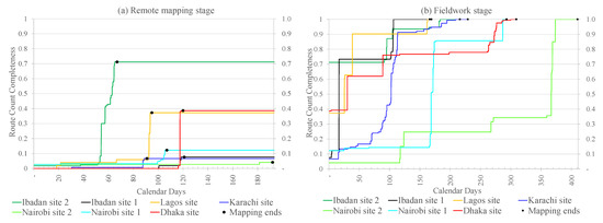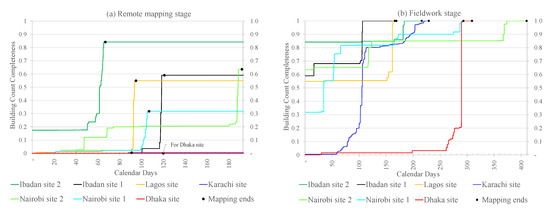 Figure 5 shows the completeness of buildings during the mapping stages in all the seven slums. The results provide empirical evidence suggestive of the possibility to achieve up to 84% building completeness during remote mapping of some slums. In this case, for the slums in Asia, Karachi site, and Dhaka site, no building completeness was achieved which means none of the remotely mapped buildings was used in the updated map after fieldwork (or all of them had to be corrected). At the time of remote mapping, Karachi site was characterized by complex rooftop architecture, making it difficult for mappers to interpret satellite imagery and digitized building footprints. The rooves were mainly concrete and made up of other small structures. This meant that almost all buildings had to be edited during Stage 2 (fieldwork). Dhaka site had "extreme" building density, which meant that buildings were close to each other, impeding satellite imagery interpretation and digitization of building footprints. Except Karachi site, the slums had mostly roofing sheets and relatively well defined building footprint interpretation in which Dhaka site was the worst case. Ibadan site 2, unsurprisingly, achieved the highest completeness during remote mapping due to its clear layout which had not changed substantially from its resettlement layout for the past few decades. Overall, during remote mapping, Ibadan sites 2 and 1 achieved the highest completeness of 84% and 59% respectively. In the case of the two slums in Asia, Stage 2 mapping was essential in achieving 100% completeness as shown in Figure 5b.