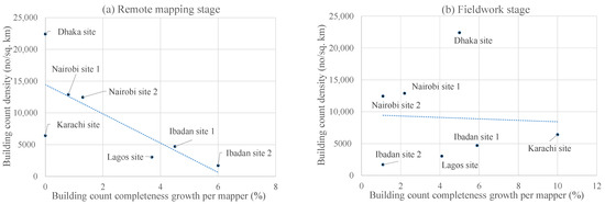 Comparison of building completeness growth per mapper and density. (a) During remote mapping stage; (b) During fieldwork stage.
