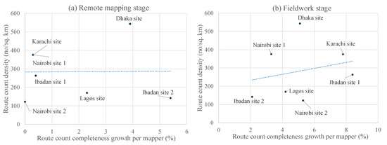 A recent study [14] in non-slum areas has shown that it is possible to achieve about 69% linear relationship between building completeness and building density based on an extrinsic approach; no consideration was given to building completeness growth and number of mappers. Figure 9a shows a better linear relationship between building count completeness growth per mapper during remote mapping (Stage 1) and building density with two outliers (Dhaka site and Karachi site), when compared with Figure 9b. The same trend was realized in terms of building area completeness. The results in Table 3, Table 4, Figure 9, and Figure 10) suggest that there should be no expectation of any mapper’s contribution to building completeness at the remote mapping stage in “extremely” complex morphological conditions (e.g., the two outliers) and there are other explanatory factors that future research needs to explore to understand the distinction across stages regarding a density versus completeness-growth relationship. The new “field” knowledge gained and used during field mapping may have influenced the distinction across stages. For example, regarding building density versus building completeness-growth relationship, the identified two “extreme” conditions (i.e., the two outliers; complex rooftop architecture and high density) are less impactful at Stage 2. As shown in Table 2, the total number of mappers differed across stages in all the sites and the difference in mappers’ experience gathered in the course of mapping may differ which in turn may influence buildings and routes completeness-growth contribution behavior (future work should look into this). Additional analysis showed an increase in the linear relationship between building density and building completeness growth without consideration to the number of mappers (Figure 10). The same was not found for routes and future work should investigate these differences further. Moreover, the relationship between route count completeness growth per mapper and route density in both stages does not show a linear trend (Figure 11). However, it is important to note that given that the sample sizes (number of data points) for generating Figure 9, Figure 10, and Figure 11 are small, these relationships described are only indicative and we are not claiming that the relationship between the variables is statistically significant (which should be investigated in future work).