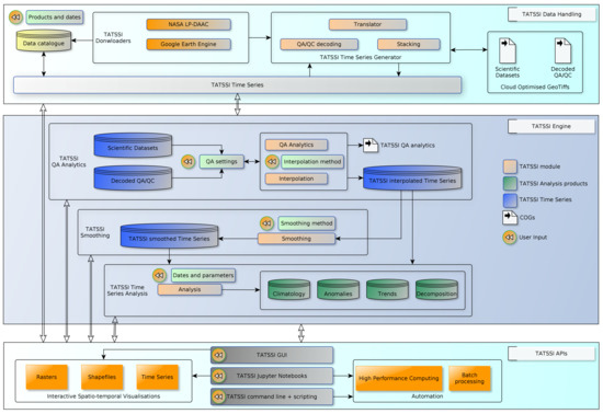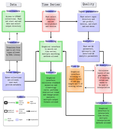 To address this shortcoming for EO time series generation and analysis by freely-distributed software, we present in this paper Tools for Analyzing Time Series of Satellite Imagery (TATSSI), an open-source platform written in Python that provides routines for downloading, generating, gap-filling, smoothing, analyzing and exporting EO time series. We extensively tested the TATSSI platform in Linux (Ubuntu 18.04 and 20.04), but it can also be executed on any Windows machine through the WSL-Ubuntu interpreter. Instructions for TATSSI’s installation can be found at this GitHub repository (accessed on 16 April 2021) along with a user’s manual and related materials presented in several scientific meetings. As TATSSI integrates the quality flags of the input products when generating time series, data quality analysis is the backbone of any analysis performed with the platform. TATSSI allows users to easily generate MODIS and VIIRS time series through the straightforward access to these scientific datasets (SDS). For fully handling with TATSSI products having different SDS, such as those from the Landsat and Sentinel missions, the users need to add some metadata, for which we provide detailed instructions in Section 2.5. By default, TATSSI produces data in the Cloud Optimized GeoTiff (COG) format, but one of its submodules enables users to generate output files in most of the formats supported by the GDAL library [30], including standard GeoTiff, NetCDF and generic binary. By developing TATSSI in Python—a complete computational language, which according to the TIOBE index (accessed on 16 April 2021) has acquired great popularity across the sciences—and by distributing it under a GNU Affero General Public License, we expect that software developers will expand its functionalities in the near future, as has been the case for Zambelli et al.’s [31] PyGRASS and the PySAL open-source Python library [32].