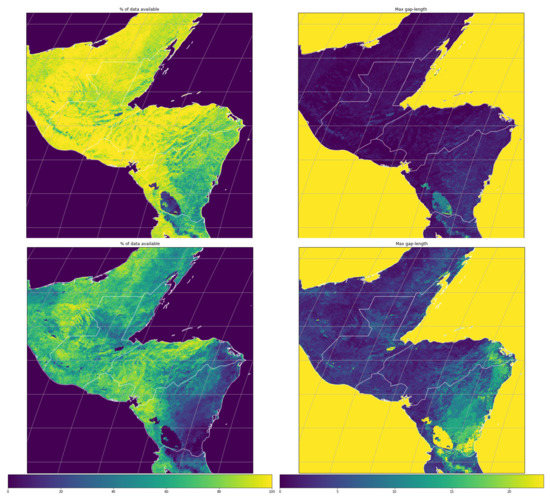 Metrics after applying two different quality assessment (QA) values for the MODLAND parameters on the “1_km_16_days_pixel_reliability” layer from the MOD13A2 product. The bottom panel shows the metrics for the “Good data, use with confidence” QA values, and the top panel shows the metrics for the more permissive “Marginal data. Useful but look at other QA information” QA values. The left column depicts the percentage of data available, and the right one, the maximum gap length.