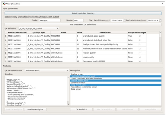 Access to TATSSI functionalities can be chosen depending on the complexity of the task, the amount of data to process and the software development expertise. TATSSI provides three APIs: (i) native GUI, (ii) Jupyter Notebooks and (iii) command line and Python scripting. The GUI was developed using PyQT5, which allows a seamless use of native Python and Matplotlib [39] to generate interactive plots, a key functionality within the TATSSI GUI. Figure 3 illustrates an example of the TATSSI GUI QA Analytics module. The dialog allows us to perform QA Analytics, as described in Section 2.3. We used a combination of multiple PyQT5 elements to allow the user to open a command dialog to select the location of a time series; write text for products and version; and select dates and QA definitions. Additionally, for every QA parameter, the application of PyQT5 elements allows us to select and unselect desired QA values. We also provided PyQT5 push buttons for the user to access different dialogue boxes.