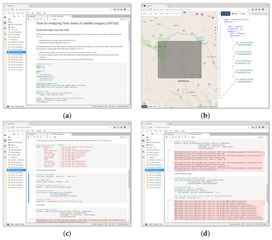 The TATSSI Jupyter Notebook interface used to download and generate a time series for an area of interest (AOI) from the MOD13A2 product. (a) Importing libraries and setting up the Google Earth Engine (GEE). (b) Defining the AOI from a GeoJSON feature. (c) The matching of scientific dataset (SDS) names. (d) Downloading and generating time series.