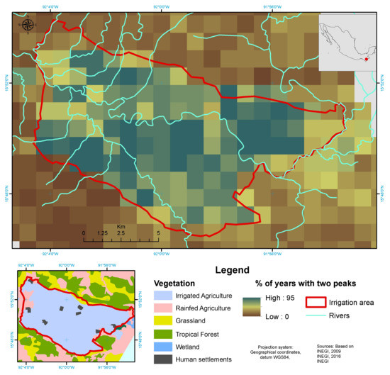 - Jönsson, P.; Eklundh, L. TIMESAT—A program for analyzing time-series of satellite sensor data. Comput. Geosci. 2004, 30, 833–845. [Google Scholar] [CrossRef]