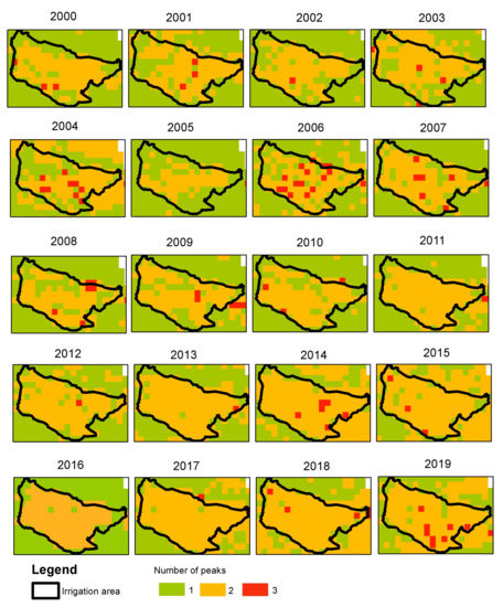 We used this multilayer stack with 0 and 1 values to group abrupt changes at the annual level. For instance, all those change-points occurring between observations 1 and 37 were considered as an abrupt change registered in 2008; and all those change-points occurring between observations 38 and 75 were considered as an abrupt change registered in 2009. This type of data aggregation is customary in applications of the change-point paradigm to EO time series (see [63]), as it facilitates comparison.