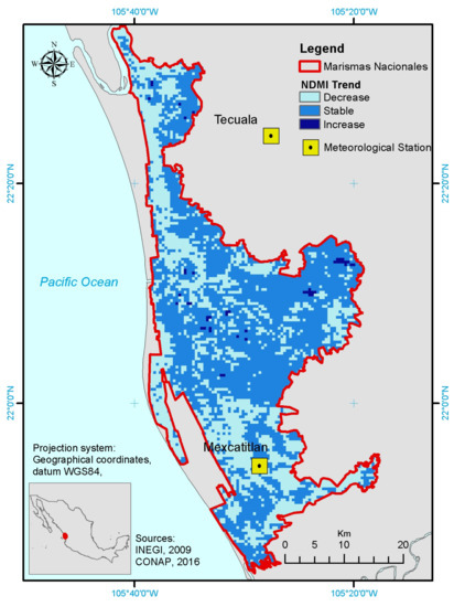 We applied the Mann–Kendall test described in Section 4.4 to the 10-day NDMI composite described in Section 3.2 at the significance level. The resulting GeoTiff (_mann-kendall_test_trend.tif) includes three values: (−1) for pixels with a significantly decreasing linear trend; (0) for pixels in which no significant evidence of trend was detected; and (+1) for pixels with a significantly increasing linear trend; Figure 10 shows this classification under the labels Decreasing, Stable and Increasing, respectively. According to our analysis, 39.73% of Marismas Nacionales territory had a significant increase in its moisture level; 0.65% showed a significant decrease; and in the remaining 59.62%, moisture seems to have had rather stable behavior during the four years observed.