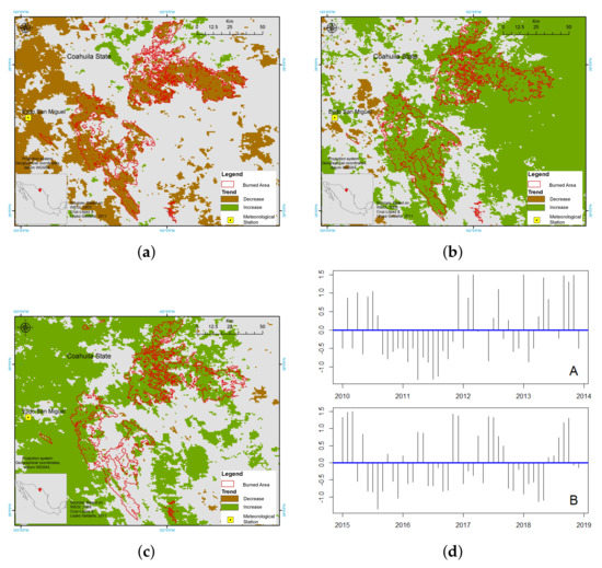 (a–c) Trend analysis describing the burned area and possible recovery at El Bonito and La Sabina in the Coahuila State. (d) Standard anomalies of precipitation at the meteorological station Ejido San Miguel: (A) 2010–2014; (B) 2015–2019. (a) EVI trend 2008–2011. (b) EVI trend 2011–2013. (c) EVI trend 2013–2020. (d) Precipitation standard anomalies at Ejido San Miguel.