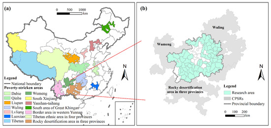 Location of the study area. (a) Spatial distribution of poverty-stricken areas. (b) Location of Guizhou Province and its neighboring poverty-stricken areas.