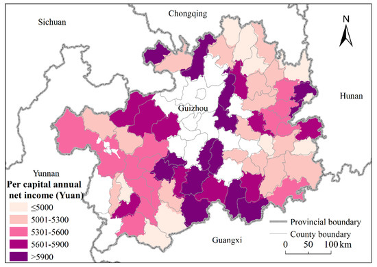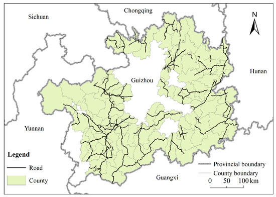 Guizhou Province is located in the southwest of China. It spans the Wuling and Wumeng areas and includes rocky desertification areas of three provinces (Figure 1). According to the 2011 definition of poverty as a per capita annual net income less than 2300 yuan, in 2013, the rural poor population was 7.45 million in Guizhou Province and it had 65 poverty-stricken counties (districts), including 15 counties (districts) in the Wuling area, 10 counties (districts) in the Wumeng area and 40 counties (districts) in the rocky desertification regions of three provinces. Figure 2, Figure 3 and Figure 4 show the spatial distribution of per capita annual net income, terrain relief within each county, and main road within study area.