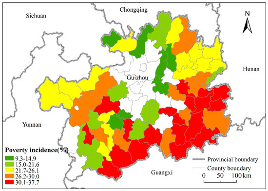 Spatial distribution of county-level poverty incidence in Guizhou Province in 2013.