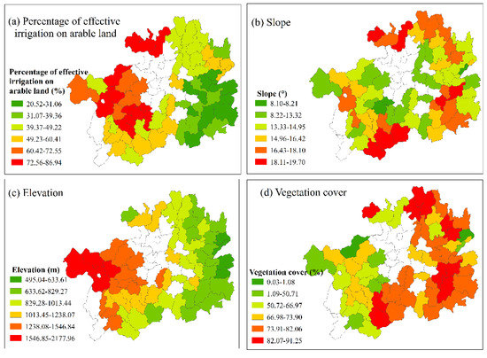 Distribution of dominant factors in Guizhou Province: (a) percentage of effective irrigation on arable land; (b) slope; (c) elevation; (d) vegetation cover. The graduation of the legends is consistent with discretization results of original explanatory variables.