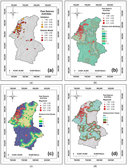 Distance from roads and distance from tracks (Figure 2c,d). Road features refer to a paved route or major road whereby track refers to an unpaved road or muddy trail used by the population in Ranau. Transportation networks are important in escaping dangerous situations and facilitating the relief and assistance of the injured require roads and streets for vehicles to pass [17]. Transportation networks also vulnerable to damages during an earthquake. An earthquake can cause fissures, sinkholes and cracks that cut roads and cause vehicles to plunge into sinkholes that suddenly appear before, during or after a main shock [39]. Instead of being a tool for emergency response, roads especially paved ones can be lethal to their users. Thus, it is important to identify which parts or location of the transportation networks in this study are within “highly vulnerable” areas to capture the impacts of extreme earthquakes in the future [40].