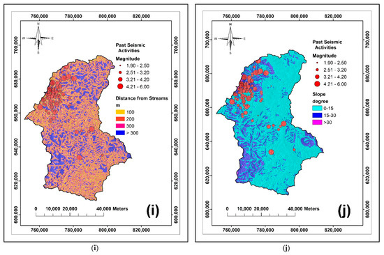 Distance from streams (Figure 2i). The importance of stream data is similar to river data as the presence of small flowing water bodies will create alluvial-sands, making the surface and the area near to the vicinity of the stream vulnerable and subject to vibration and lubrication. As a result, man-made features especially buildings near the stream networks are subject to slip [17,50].
