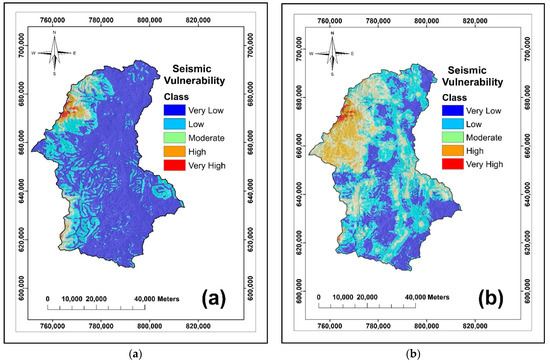 Seismic vulnerability map computed using FR-IoE model (a) and (FR-IoE) AHP model (b).