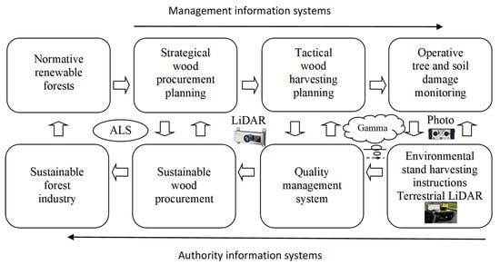 Several GISs are available for the development of damage monitoring and control systems. They have been validated carefully in relation to the development of a quality management system for wood procurement. Hypothetically, in terms of damage detection, an automatic monitoring system based on the image processing of either photography or laser scanning could provide decision support to stakeholders while taking account of the quality-related factors of sustainable wood procurement during daily logging operations. However, as described above, daily planning systems are more important for wood procurement managers than authorities. Ultimately, they must be spatially based on the causal and consequence assessments of reported wood harvesting conditions and damage risks. It is always useful to synthesize the observations of a literature review by utilizing an information flowchart when designing quality management systems. Therefore, as the basic structure of the management system, three separate databases were assumed for stakeholders (Figure 1). These databases are already available in practice. Based on them, Figure 3 presents a flowchart of spatial information needs for a GIS-based wood procurement quality management system. In regard to this proposed structure, future research will certainly compare the efficiency of photogrammetry and laser scanning systems for the development of wood harvesting planning and quality management systems in terms of their accuracy and costs, respectively.