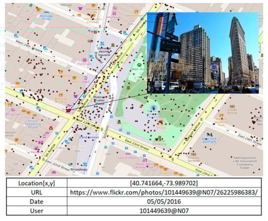 Broadway on 23rd street, Manhattan, NYC, with superimposed Flickr photo locations (depicted as points, background), and metadata of a specific photo (bottom). Background: Google Maps.