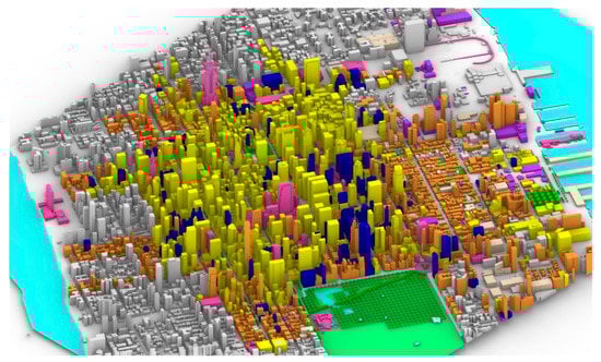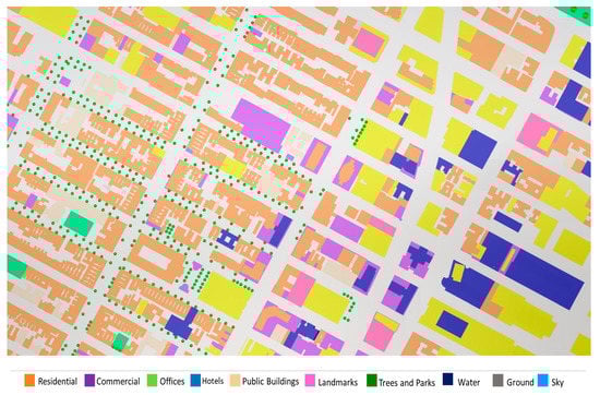 To carry out the analysis, we first build a detailed 3D model of the analyzed area. A Rhino 3D model of Manhattan is compiled based on a detailed 3D model acquired from CADMapper (https://cadmapper.com/ accessed on 2 February 2021), which includes the topography, buildings/structures, parks, and water bodies. To differentiate among the various urban features for geovisualization analysis, we have distinguished by color the different elements of feature categories of the area (e.g., land use, landmarks, buildings, trees). Vegetation, i.e., small size parks and single trees, where obtained from NYC Open Data census (https://data.cityofnewyork.us/Environment/2015-Street-Tree-Census-Tree-Data/pi5s-9p35 accessed on 2 February 2021); landmarks, land use and feature (building) categories were obtained mainly from foursquare (https://foursquare.com/ accessed on 2 February 2021) and Zola (https://zola.planning.nyc.gov/about/ accessed on 2 February 2021); street-level commercial facades were obtained from Google Street View. The resulting 2D representation of this process is depicted in Figure 4 (top), where Figure 4 (bottom) depicts the Rhino 3D model of the area with the urban fabric; in both images, the colors represent the different object categories used in our analysis. For example, orange depicts residential buildings, purple depicts commercial buildings, pink depicts landmarks, and green depicts trees and parks.