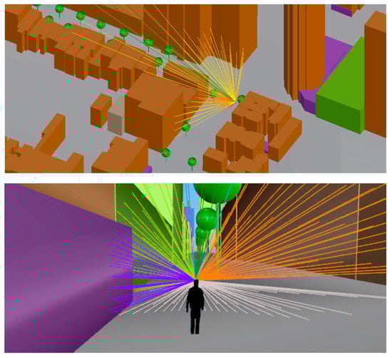 Simulating the visibility from a single viewpoint along the route: perspective view (top) and street-level view (bottom). LOS are depicted as straight lines in different colors according to the urban fabric element category they meet.