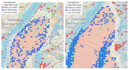 Figure 6 depicts the cluster analysis based on Moran’s I Anselin local analysis. The left image depicts our approach, in which only the tourism photographers are clustered, while the right image depicts all photo clusters exist in the area. The left image presents a clear distinction among different neighboring cells having varying values, making it easy to identify more popular locations in the area that are highly clustered—High-Low outliers (hot-spots). It is also easy to identify less popular locations that are tagged as Low-High outliers (cold-spots). Unalike, the right image is much more homogenous, showing relatively similar cluster values for neighboring cells represented by High–High clusters, distributed uniformly in the central area of Manhattan, which makes it hard to identify the more popular locations. This proves that using tourism photographers, instead of photos, helps in revealing the popularity and attractiveness of different areas that are derived from tourism photographers’ activities and patterns.