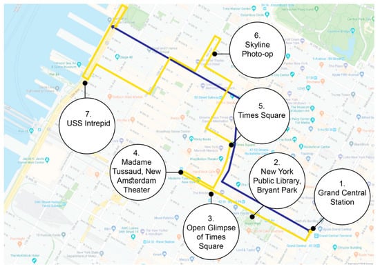 Tourism walking route in Manhattan (case study 1) computed by our algorithm (yellow) and the shortest path according to Google Maps (blue), with the identified landmarks and attractions along the routes (background: Google Maps).