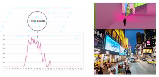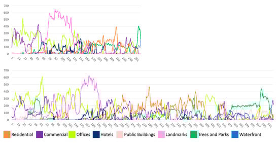 To validate the proposed tourism route planning methodology and results, we carry out a quantitative evaluation with the 3D visual analysis tool, which comparatively analyzes and assesses the visual experience of a user walking in the tourism route. To quantitatively understand and visualize the outcome of the 3D visual analyses, we geovisualize all object category types by graphs, depicted in Figure 8, where the X-axis is the accumulated walking distance of the viewpoints along the path (route), and the Y-axis is the square root of the distance of the lines from the observer to the object. For comparative purposes, we also present the shortest route. The shortest path has 275 viewpoints, half the length of the tourism route, having 547 viewpoints. Figure 9 depicts the landmark category type (depicted in pink), where we can see that the tourism route has seven landmark peaks, which correspond to the landmarks depicted in Figure 7, dispersed along the route, meaning that it is rich with these objects, having a high peak -sequence and -magnitude; the shortest Google Maps route depicts a single landmark, which is Times Square. The geovisualization of the 3D visibility analysis validates that the overall impact and experience of landmarks is very high in the tourism route, giving the pedestrians a heterogeneous and attractive walking experience, which is the result of the accumulated knowledge retrieved from the Flickr tourism photographers’ trajectories.