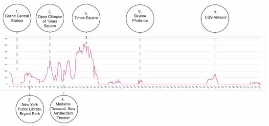 Accordingly, we have defined a value duration of five days to define the walking tourism activity and travel characteristics of the analyzed area in Manhattan. This value was cross-referenced with official reports from Manhattan, whereas a survey made by the Alliance for Downtown New York (https://www.seathecity.com/nyc-tourism-facts-statistics/ accessed on 2 February 2021) in 2018 found that the average number of days tourists stay in Manhattan is 5.5. This supports our assumption regarding the tourism activity in our analyzed area, validating our holistic approach to work with adaptive calculated values.