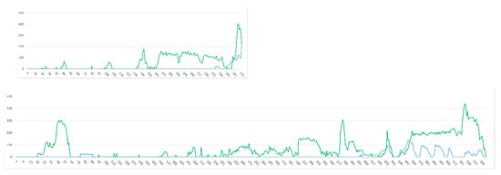 Geovisualization graph of case study 1 showing the green objects category type (green) and open sky category type (blue). The shortest route (top) and the tourism route (bottom).