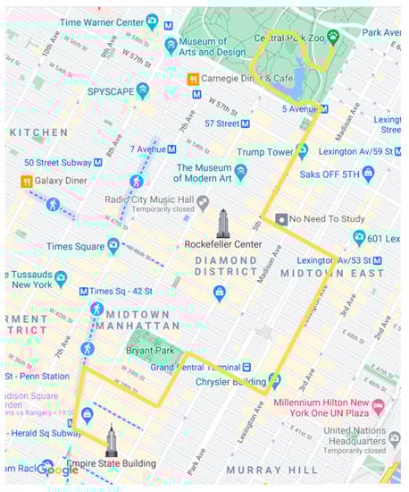 The origin point is Empire State building, and the destination point is Central Park Zoo. Figure 11 depicts the resulting tourism walking route, which passes through main landmark and attraction locations in the area existing between the defined origin and destination points, validating that it traverses more popular cells using the maximum f-popularity score. The attractions include the Chrysler Building, Grand Central Terminal, view to Rockefeller Center building, 5th Avenue, and Bryant Park. Furthermore, in its north part, the tourism route makes a detour inside Central Park, revealing a scenery view route that is traversing through main popular POIs inside the park—a detour calculated thanks to the popularity measure generated from the existing photos.