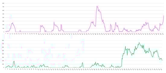 Geovisualization graph showing the landmark category type (pink, top) and the green objects category type (green, bottom) visible from the tourism route of case study 2.