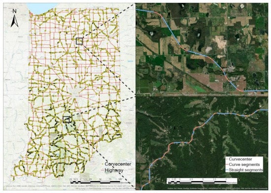 The horizontal curve segments are generated as the primary data. To do so, the road network database provided by FHWA Highway Performance Monitoring System (https://maps.indiana.edu/layerGallery.html?category=Streets, accessed on 26 April 2021) was used to detect and extract horizontal curve segments by ROCA (ROad Curvature Analyst) [] tool in ESRI ArcGIS. Figure 1 shows state-wide curve segment distribution and two typical road curve identification examples at the plain area and mountain area. Out of a total 17,381 km road network for Indiana State Route and US Highway, 1545 km curve segments were identified and adopted as the base units. Four independent variables were selected for crash count modeling.  Among them, the radius and length of curves are calculated by the ROCA software as geometric variables. Although curve radius and curve length are designed by a certain correlation in the planning process. In this paper, curve segments are identified from the road network shapefile, meaning that the length of a curve segment is not correlated with its radius (correlation efficiency between them is 0.337).