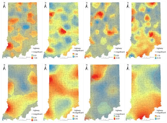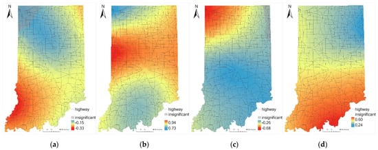 In Figure 2d, the AADT (LOGA) coefficient distribution of GWNBR demonstrates high values in the south and southeast of Indiana. There also exists a small area of the non-significant coefficient area in the northeast. About the GWPR model in Figure 2d, an insignificant coefficient area is mainly located in the north of Indiana. GWNBRg (bottom row) presents a more general coefficient decreasing trend from south to north.