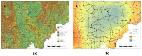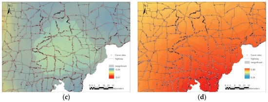 In respect of curve distribution density, there are also patterns observed from Figure 4. For the area with significant coefficients in Figure 4c, the locations with sparse curve segment distribution show higher absolute values of pavement friction coefficient than the rest area at a 95% confidence level. Considering it is also a low population density cultivated cropland, it is explainable that pavement friction highly influences the curve crash frequency in sparsely populated fields, where highways are mostly straight.