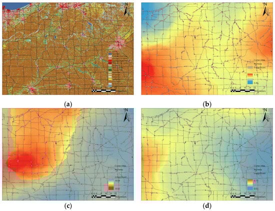 Landcover (a), distribution of (b) LOGL, (c) LOGF, and (d) LOGA in GWNBR in a plain area in northern Indiana.