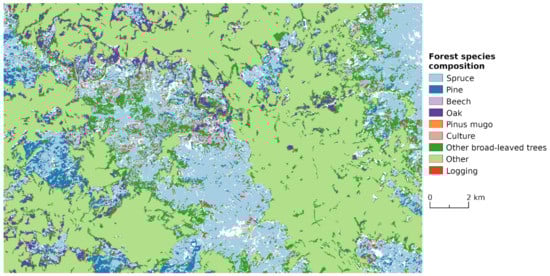 The Forest Management Institute processed a complete classification of forest species composition for the entire Czech Republic. The primary source of classification was LANDSAT-7 satellite data. Species were identified according to different spectral characteristics. Specifically, the following categories of forest species composition were defined: spruce, pine, beech, oak, other broad-leaved trees, culture (young trees less than 1.3 m in height), pinus mugo, other (mixture of trees) and logging (or forest clearing) [37]. The spatial resolution of the data is 10 m. Figure 3 shows an example of species categories identified from the satellite images. For the present research, we requested the classified raster dataset from FMI.