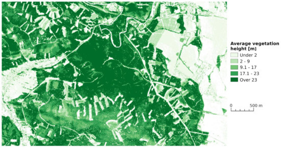 The FMI has also processed raster data on the height of forest trees. Data were created by combining a digital terrain model with digital relief model data. From this information, the average height of the forest stands in individual pixels was determined. The spatial resolution of the data is 2 m [38]. Figure 4 presents an example of this data. For our processing, the data were recalculated from the 2 m resolution to the 10 m resolution, and the average value of height was assigned. For the present research, we requested the raster dataset results from the FMI.