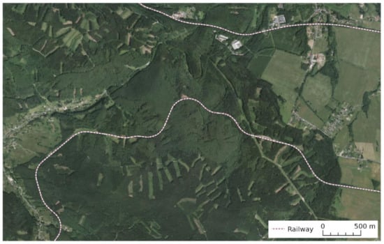 Wilting of vegetation in the stand mainly due to degradation of the trunk and root systems can significantly affect its resistance to external effects. Forest health data was compiled for the entire territory of the Liberec Region; however, for the detailed description in this article, only a smaller area was defined, which included a major part of the railway track leading through forest stands. The current orthophoto map (Figure 5) and vector layer from the Digital Geographical Model of the Czech Republic–Data 50 were used to verify whether the vegetation was actually present in the area [41].