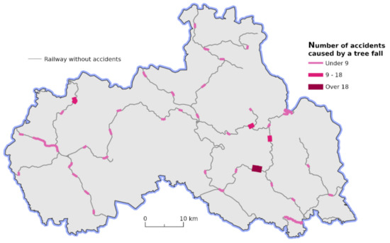 Nevertheless, we were able to roughly compare the sites at threat identified in our study with the actual number of accidents, although the comparison is not reliable. The number of accidents and their locations along the railway section where they occurred are shown on the map in Figure 6.