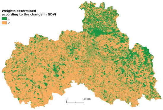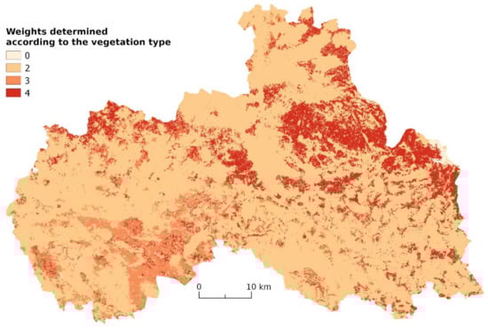 An important step was a reclassification of the source raster with forest species composition (described in Section 3.1). Individual species were assigned weights according to the expected degree of threat from intense wind and snow. Their values were determined according to already previously published forestry studies. Coniferous species, for which a higher degree of threat is expected because of their shallower root systems, were evaluated with greater weights. No threat was expected for pinus mugo, logging and culture (which includes vegetation in the range of 0.6 to 1.3 m in height) [8]. Species compositions with assigned weights are listed in Table 2. Figure 8 shows the reclassified raster for the Liberec Region according to weight.