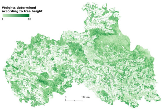 Raster with weights according to the average height of forest stands for Liberec Region in the period 2016–2017.