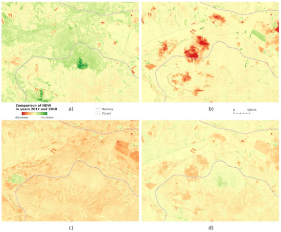 We evaluated the vegetation health around railway infrastructure using Sentinel-2 satellite images. These European Space Agency satellites have a circulation time of 5 days. The spatial resolutions of the images are 10 and 20 m [40]. We selected and processed images with minimum cloud cover from 2017 and 2018 with 20 m resolution. The images already had atmospheric corrections applied by the provider. The effect of low cloud in the images was removed with layers which masked the areas they affected. Three periods from each year were compared to increase the objectivity of the results and reduce the effects from extraordinary climatic conditions which influence the vegetation cycle. The data were resampled from 20 m to 10 m resolution to correspond to other data sources.