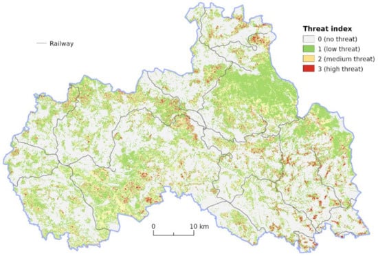 The spatial resolution of the resulting threat layer is 10 m and depends on the resolution of the input data. Source data about forest species composition has a spatial resolution of 10 m, and data about the height of forest stands have a spatial resolution of 2 m recalculated to a resolution of 10 m with an average value of height. The Sentinel-2 data were resampled from 20 m to 10 m resolution to correspond to other data sources. As a result, individual trees which present a threat cannot be accurately identified. The results may be used as a tool to identify the general location of areas of threat and could be checked through more detailed scanning. The advantages of the proposed evaluation methodology are the use of freely available remote sensing data with a high frequency of updates and the evaluation of large areas without direct field investigation. Field investigation could be targeted to locations identified as containing potential threat. The data were obtained for the years 2017 and 2018. Accessing data from the FMI on species compositions and stand heights were limited, in contrast to Sentinel-2 data, which is freely available. If newer data becomes available, recalculating to obtain results for 2020 does not pose a problem.