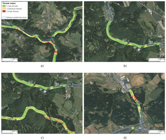 The assessment of threat caused by adjacent tree vegetation is a seldom discussed topic in the Czech Republic and around the world. Some countries create railway protection zones without tree vegetation or only with trees of low height and therefore do not need to solve issues of identifying potential threat due to falling trees. Hoerbinger et al. concerns vegetation risk on railway used aerial laser scanning [35] in a relatively short line (27 km). The aerial laser scanning is more expensive but more precise in resulted detail. There is an opportunity to use video cameras, thermo-cameras and/or laser scanners mounted on commercial trains for integrating the information acquired from the satellites. These possibilities also need extra costs and organisation demands. Our presented method does not need any costs in the present. Moreover, it is possible to calculate the threat for the whole area in the Czech Republic. In addition, there is an opportunity to scan the track surroundings using a LiDAR only in areas that were identified by VTIR calculation. Subsequently, a precise definition of tree structures and the discovery of stand-alone trees would provide.