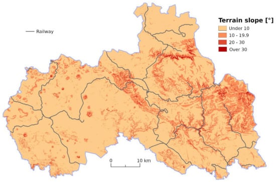 The proposed idea is to integrate the influence of the morphology of surrounding terrain, namely the slope of hillsides and embankments. The steep slopes increase the threat. Hoerbinger et al. defined five geometric categories: depressional to level (−10° to 10°), gently sloping (>10° to 20°), steeply sloping (>20° to 30°), very steeply sloping (>30° to 90°) and downward sloping (>−10° to −90°). Figure 16 shows the terrain slope in the Liberec Region. The calculation is based on free accessible data of the Digital geographical model of the territory of the Czech Republic (Data50)–Terrain relief [41]. The calculation of slope areas is presented in Table 4 for the protection zone in the Liberec Region. The steeply and very steeply sloping areas cover only 3.8% of protecting zone together. This small part could be affected by the influence of the slope. Nearly 80% of the area remains untouched by slope influence.
