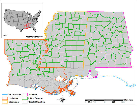 This study focuses on the inland counties of the Southeastern U.S. Six Southeastern states bordering both the Gulf of Mexico and the Atlantic Ocean (Texas, Louisiana, Mississippi, Alabama, Georgia, and South Carolina) were preliminarily selected as the study area for this research because these states are routinely hit by TCs. Florida was not included because all Florida counties are coastal as defined by this research, and this is described in the next section. Texas, Georgia, and South Carolina have an insufficient sample size of counties with inland property damage, so they were excluded. For these reasons, Alabama, Mississippi, and Louisiana were selected as the study area for this research.