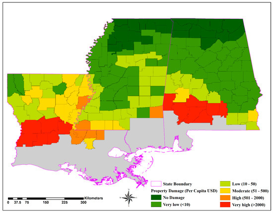 Regionally, the southern part of the study area sustained higher per capita damage compared to the northern part. In particular, the southwestern Alabama and Louisiana region had the highest per capita damage (>USD 2000) and counties in inland Mississippi had the lowest average per capita damages (Figure 2). Inland counties in Alabama had the highest average property damages (USD 2134.85 average per capita damage) followed by inland counties in Louisiana (USD 1617.12 average per capita damage). In fact, 7 out of the 10 highest per capita damages sustained by the counties during the study period are in Alabama and 3 of them are in Louisiana. Inland counties in Mississippi had mostly very low-moderate level of per capita damages (>USD 50) with a few exceptions (some southern counties in this state had moderate–high per capita damages). A total of 25 counties in the study area had no damages reported during 1996–2018, located in northern Alabama and Mississippi.