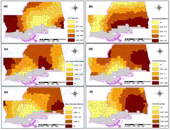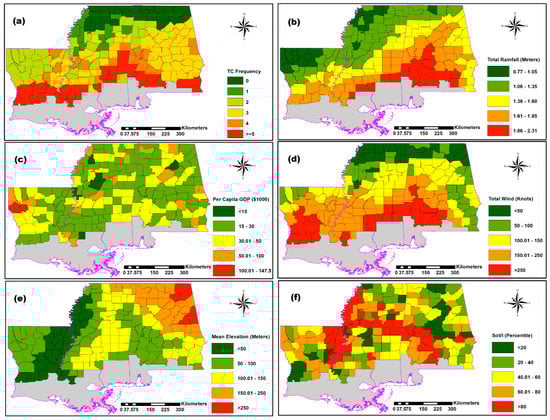 Spatial patterns and distributions of six factors: (a) TC frequency; (b) total TC rainfall (m); (c) county per capita GDP; (d) total TC wind (knots); (e) county mean elevation (m); and (f) county SoVI percentile.
