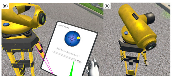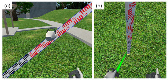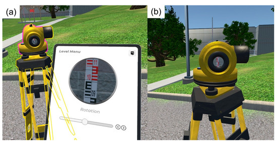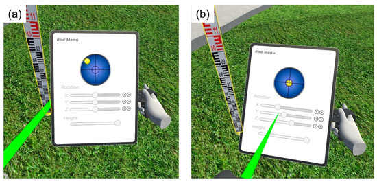 In real life, a surveyor will hold the rod with a circular bubble attached to it, trying to level it. Such a hand movement cannot be replicated with high accuracy in VR; therefore, a different approach using the virtual tablet was followed. By selecting the rod, the user can see a menu with three axes on the virtual tablet and see the leveling state of the rod (Figure 5a). The virtual bubble moves out of the edges of the circular vial when the rod is leveled to within 1° (the circular vial ranges from −1° to +1°). There are two controls in each axis. The first control moves a slider that allows for coarse rotations for approximate leveling of the rod. Then, using the arrow buttons, the user applies finer rotations for precise leveling of the rod. The fine arrows make changes of 0.01° (36′′) each time. This allows for leveling the rod within 30′′ to 1′ in most cases. Figure 5b shows an example of the rod being leveled. With this workaround, students understand that they have to level the rod before moving to the next lab step, thus maintaining this specific learning objective. Finally, the user can expand and collapse the rod as needed in one-meter intervals up to five meters (see “Height” slider in Figure 5).